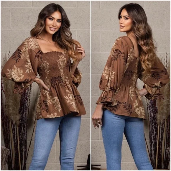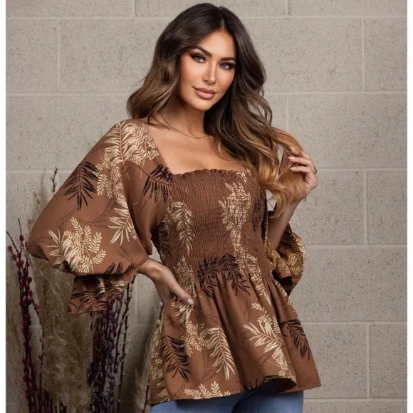 Crafted in the USA, this women's top features a deep mocha brown hue adorned with a fern leaf pattern. It showcases a cinched upper design, elasticized flared wrists, and a peplum silhouette. The square neckline and ruffled long sleeves add elegance, while the lightweight, breathable, and stretchy woven fabric ensures comfort without sheerness. This top combines quality craftsmanship with stylish details for a refined look.