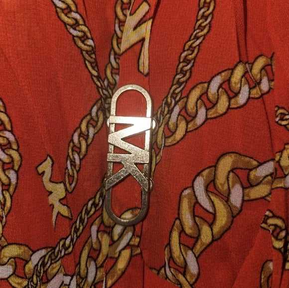 The professional and informative product description for the product "Chain Pleated Tank Top" is as follows: This tank top comes in an optic orange color and has a pullover design with a v-neck and sleeveless cut.