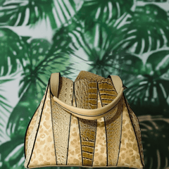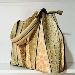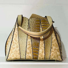 Expertly crafted from vegan leather with a striking cheetah print and faux ostrich material, this product set includes a top handle beige handbag and a matching wallet for a sophisticated and stylish look.