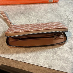 Stand out with this sophisticated Taupe wristlet wallet featuring a bold logo. Crafted from faux leather with silver-tone hardware, it includes 12 card slots, 3 compartments, and a zippered pocket for organized storage. The zip-around closure secures your belongings, while the detachable 6-inch wrist strap offers convenient carrying without sacrificing style.