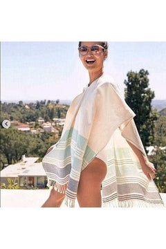 The Caftan Coverup from the Tribe Alive brand is an expertly hand-woven piece, crafted by skilled artisans in Jaipur, India. Made from durable and heavyweight cotton, this caftan is designed to flatter all body types while providing a lifetime of use. Available in three colorways - Sunburst, Nautical, and Seafoam - this one-size-fits-all piece features a V-neck, open sides, and a fringe hem. It can be worn as a swimsuit coverup, a poncho, or even as a beach wrap, making it a versatile addition to your wardrobe.