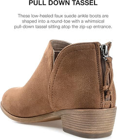 Show off versatile style with the side-split booties by Journee Collection. These ankle booties have soft faux suede uppers that rise to the ankles and highlight a side-split detail and back zippers with tassel accents. Heel Height:1 1/2-inch Heel Type: Stacked Platform Height:1/2-inch Shaft Height:3 1/2 inches Top Circumference:11 1/2 inches Shoe Width: Medium Closure Type: Back Heel Zip Toe Style: Round Lining: Fabric Upper Material: Faux Suede Outer sole Material: Man-made Footbed: Padded