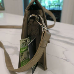 Elevate your everyday style with this sophisticated Badgley Mischka crossbody handbag, crafted from luxurious vegan leather in a versatile taupe hue. The sleek silhouette features eye-catching silver lettering that adds a touch of designer elegance to any outfit. Perfectly proportioned at 9.5" x 6.5" x 3", this compact yet spacious bag transitions seamlessly from day to night, offering both practicality and polished refinement for the modern woman who refuses to compromise on style or ethics.
